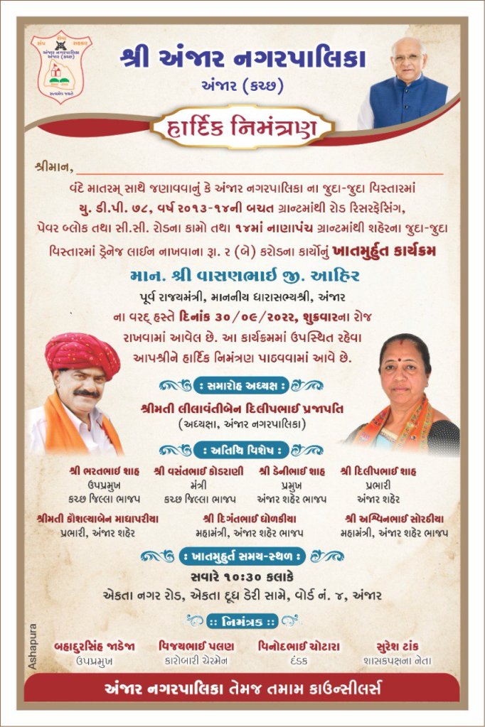રાજ્ય સરકાર શ્રી ના આદેશ અનુસાર રાજ્યના વહીવટમાં પારદર્શિતા વધે અને પ્રજાની વ્યક્તિગત રજૂઆતોના ઉકેલની ઝડપ વધે તે માટે મહાનગરપાલિકા અને નગરપાલિકા કક્ષાએ “સેવાસેતુ” કાર્યક્રમ (શહેરી -આઠમો તબક્કો) યોજવાના જિલ્લા કલેકટરશ્રી ના આદેશ અનુસાર અંજાર નગરપાલિકા દ્વારા પૂર્વ રાજ્યમંત્રી અને ધારાસભ્ય શ્રી વાસણભાઇ જી આહીર ના અધ્યક્ષ સ્થાને તથા નગર અધ્યક્ષા શ્રીમતી લીલા વંતીબેન દિલીપભાઈ પ્રજાપતિની વિશેષ ઉપસ્થિતિમાં એક “સેવાસેતુ” કેમ્પ વોર્ડ નંબર ૧ થી ૯ ના પ્રજાજનો માટે તા.૧-૧૦-૨૦૨૨ શનિવારે યોજાશે. સવારે ૯-૦૦ક.થી ૨-૦૦ ક.દરમિયાન અરજદારો પાસેથી રજૂઆતો તેમજ તેના પુરાવા મેળવવા અને ૨ -૦૦થી ૫-૦૦ ક.દરમિયાન સ્થળ પર કાગળોની ચકાસણી કે તપાસણી કરી તેનો સ્થળ પર યોગ્ય નિકાલ કરવામાં આવશે. નગરપાલિકાના મુખ્ય સભાસ્થળ ખાતે આ કાર્યક્રમ યોજાશે. જેમાં રાજ્ય સરકાર શ્રી ની વિવિધ યોજનાઓ, બેન્કેબલ યોજનાઓ, ટેક્સ આકારણી, પાણી કનેક્શન, ડ્રેનેજ કનેક્શન ,જન્મ મરણના દાખલા ઓ,શોપ લાયસન્સ, રોડલાઈટ, લગ્ન નોંધણી વગેરેની વ્યક્તિગત રજૂઆતોનો નિકાલ કરવામાં આવશે. જેનો લાભ લેવા અંજાર નગરપાલિકાના ઉપપ્રમુખ શ્રી બહાદુરસિંહ ડી.જાડેજા, કારોબારી સમિતિના ચેરમેન શ્રી વિજયભાઈ ડી.પલણ, શાસક પક્ષના નેતા શ્રી સુરેશભાઈ એ.ટાક, દંડક શ્રી વિનોદભાઈ ચોટારા ચીફ ઓફિસર શ્રી પારસભાઈ મકવાણા અને કચેરી અધિક્ષક ખીમજી પાલુભાઈ સિંધવ ની સંયુક્ત યાદીમાં જણાવ્યું છે.