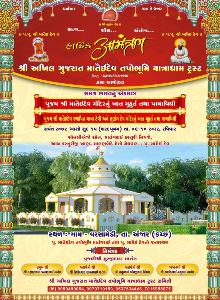 સમસ્ત મહેશ્વરી મેઘવાળ સમાજ ને જણાવતા આનંદ થાય છે કે વરસામેડી મધ્યે પૂજ્ય શ્રી માતઇદેવ નું ભવ્ય મંદિર નું ભૂમિ પૂજન આવતી કાલે તા. ૦૯/૧૦/૨૦૨૨ રવિવાર શરદ પૂનમ ના સવારે ૦૯ થી ૧૧ વાગ્યે નિર્ધારિત કરવામાં આવેલ છે.