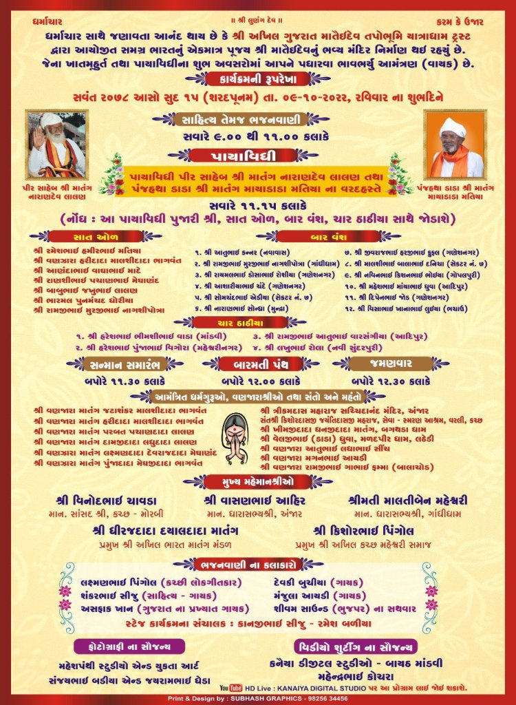 સમાજ ના દરેક આગેવાન, વડીલો, ધર્મગુરુઓ ને આમંત્રિત કરવામાં આવેલ છે તેમ છતાં કોઈ નામ રહી ગયેલ હોય ભૂલ ચૂક હોય તો પોતાના સમાજ નું દાદા નું કાર્ય હોઈ ભૂમિ પૂજન માં પધારવા હાર્દિક નિમંત્રણ છે.
