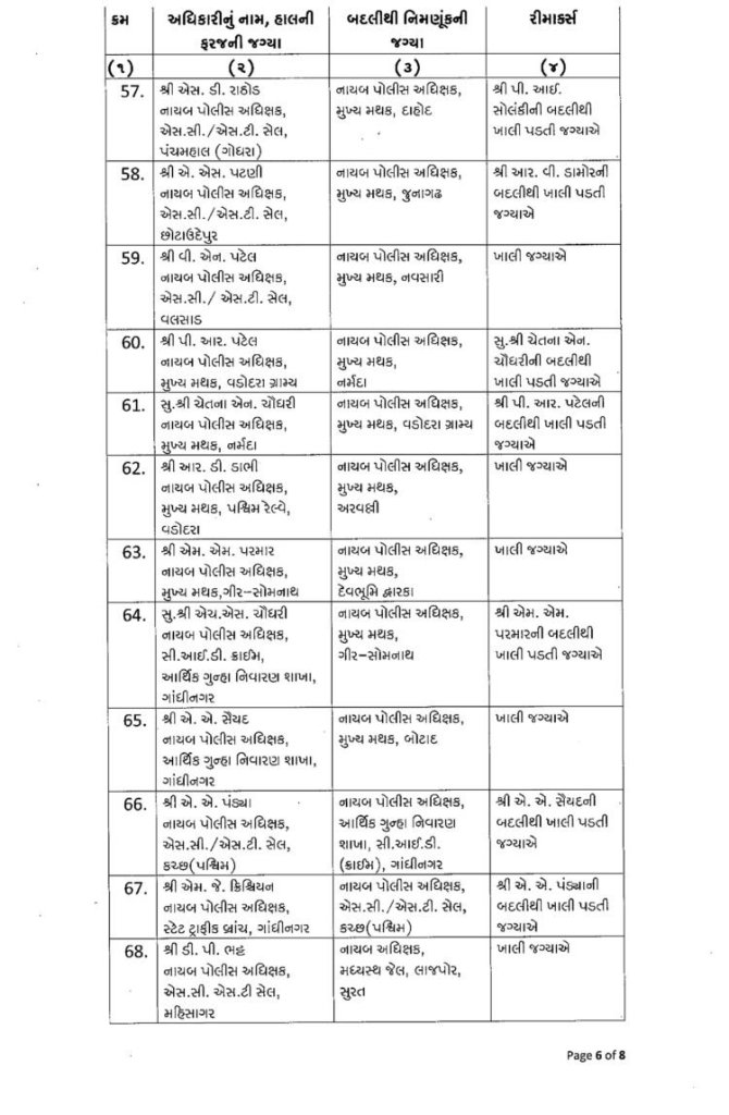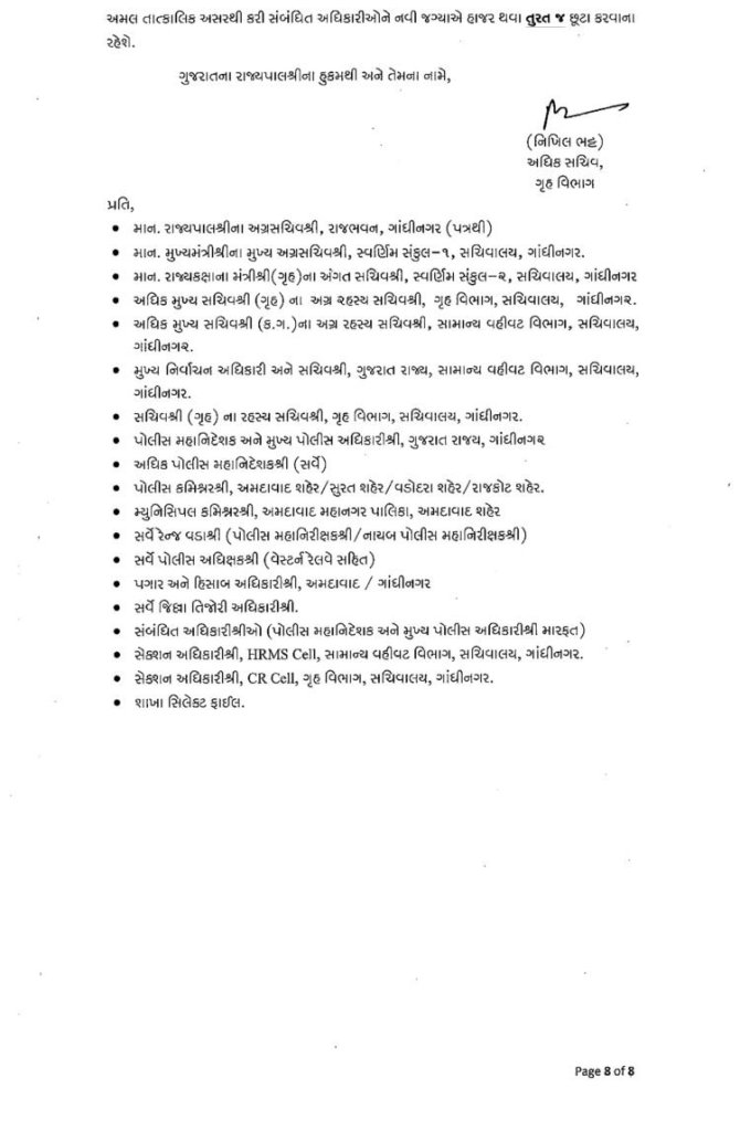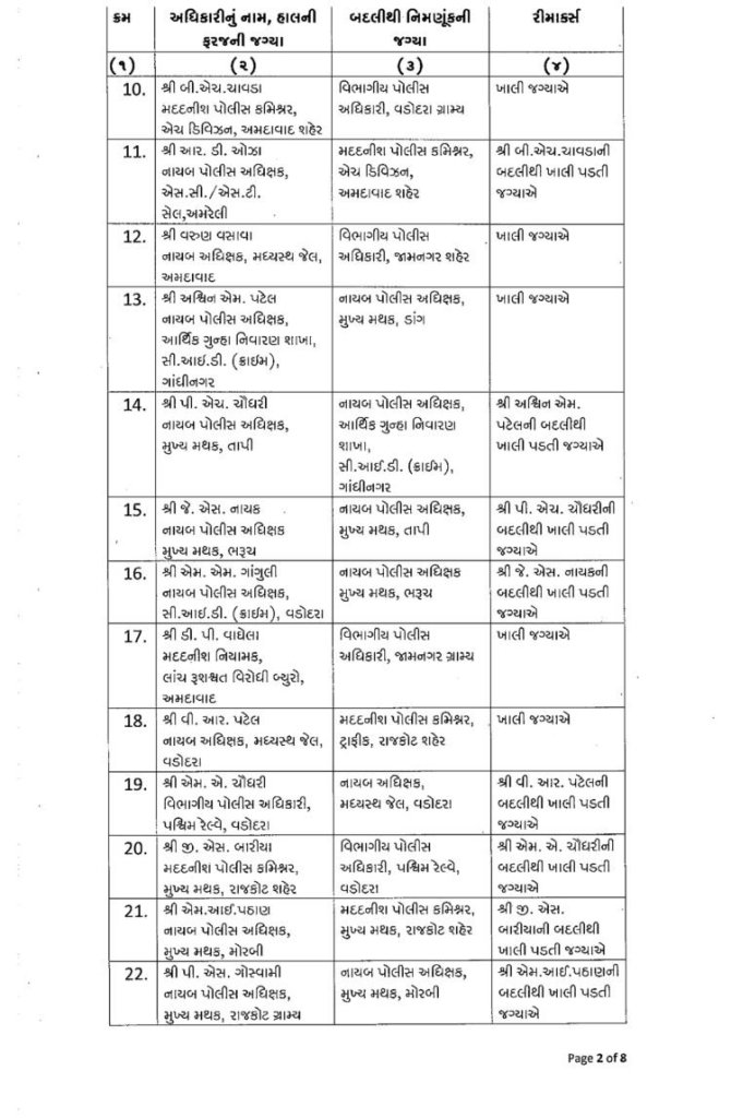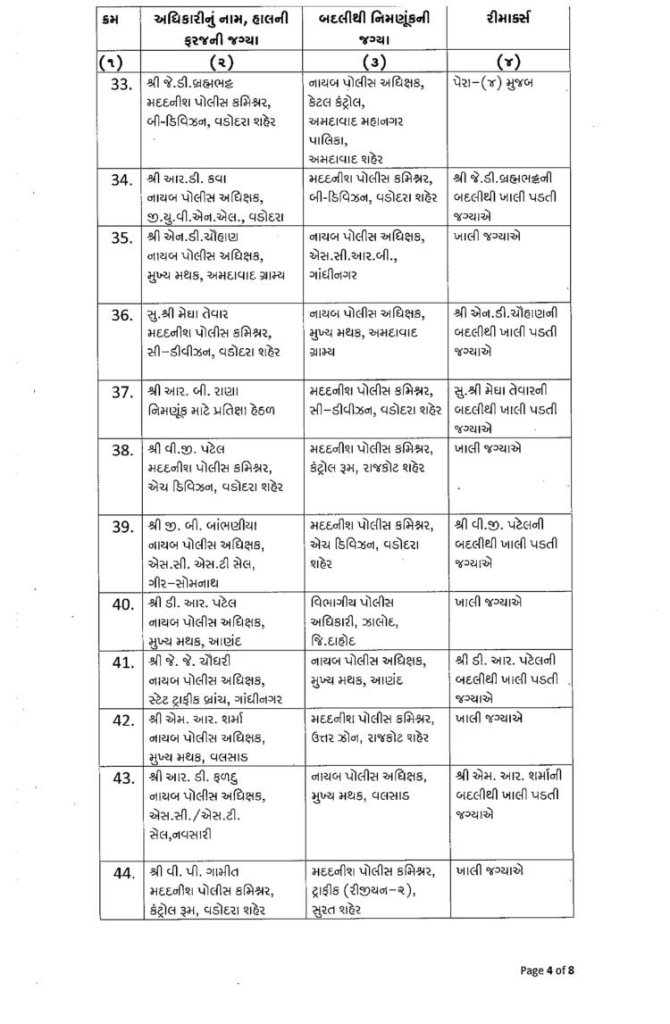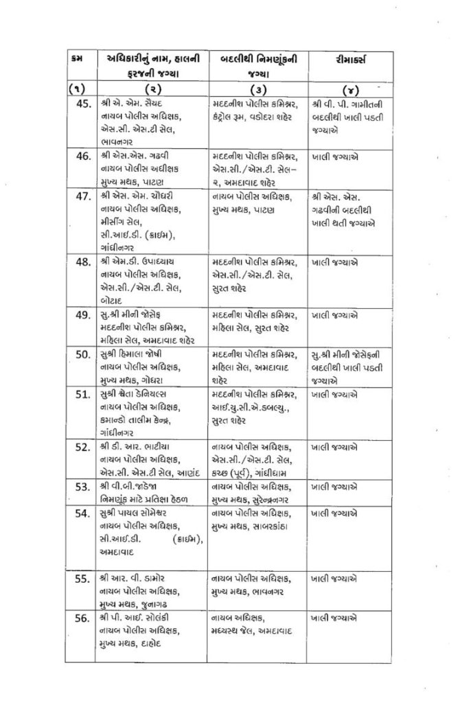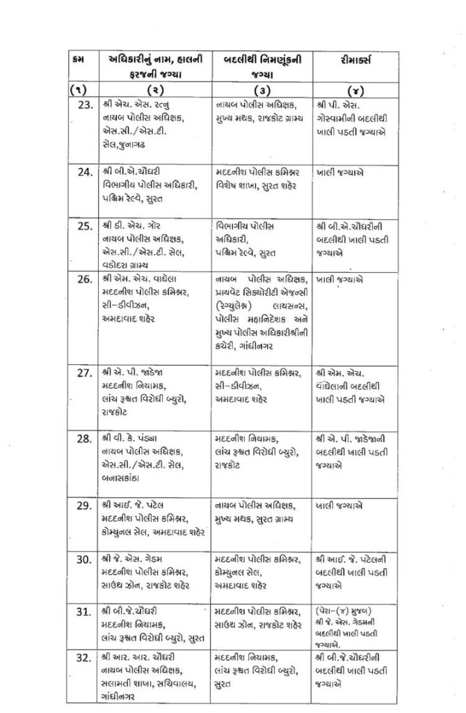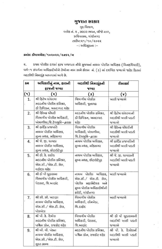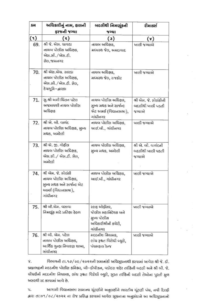 ગુજરાત : મા વિધાનસભાની તારીખ ગમે તે સમયે જાહેર થઈ શકે છે. ત્યારે ફરી એકવાર પોલીસબેડામાં બદલીનો દોર શરૂ થયો છે. રાજ્યમાં એક સાથે 76 DySPની બદલી કરવામાં આવી છે. આ બદલી ચૂંટણીલક્ષી હોવાનું અનુમાન લગાવવામાં આવી રહ્યું છે. જોકે આગામી સમયમાં ચૂંટણી પહેલા IPS અધિકારીઓની પણ બદલી પણ થઈ શકે છે. ગુજરાતમાં ચૂંટણી પહેલા ગૃહવિભાગ દ્વારા રાજ્યના બિન હથિયારી 76 DySPની બદલીનો આદેશ આપવામાં આવ્યો છે. ખંભાળીયાના હિરેન્દ્ર ચૌધરીની અમદાવાદમાં મદદનીશ પોલીસ કમિશનર ડી ડિવીઝનમાં બદલી કરવામાં આવી છે. જ્યારે અમરેલીના આરી.ડી.ઓઝાની અમદાવાદમાં પોલીસ મદદનીશ પોલીસ કમિશન એચ ડિવિઝનમાં બદલી કરવામાં આવી છે. ગૃહ વિભાગ દ્વારા બિન હથિયારી 76 DySPની બદલીનો આદેશ નીચે મુજબ છે.