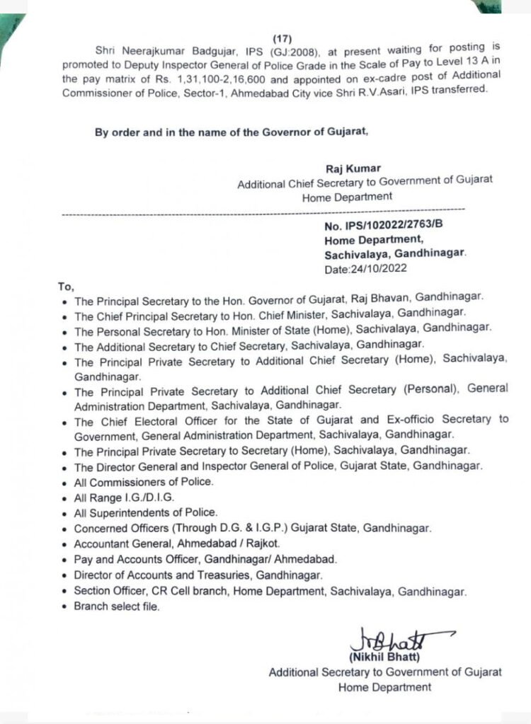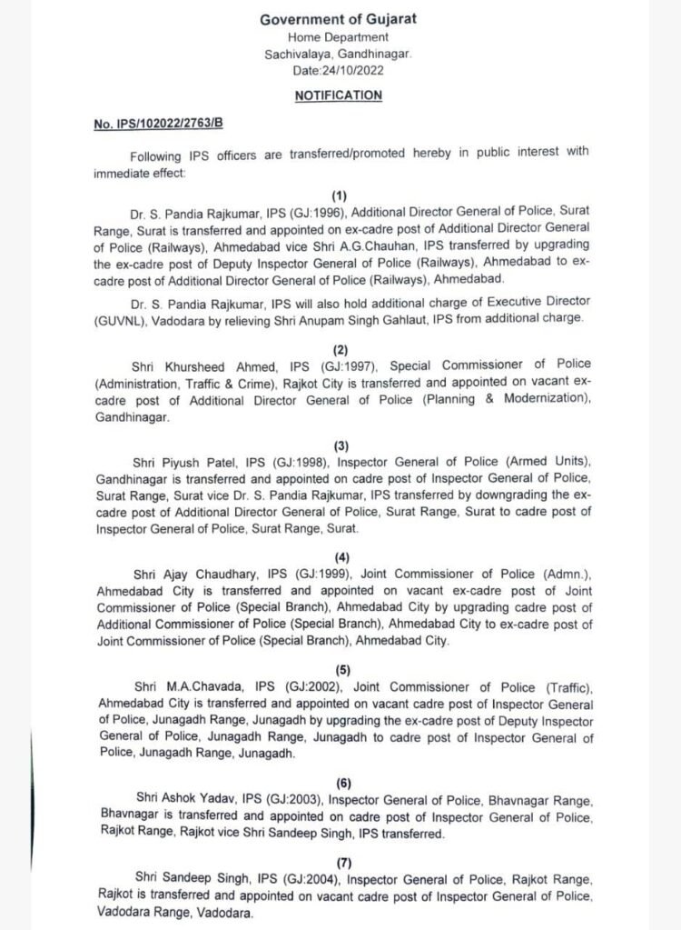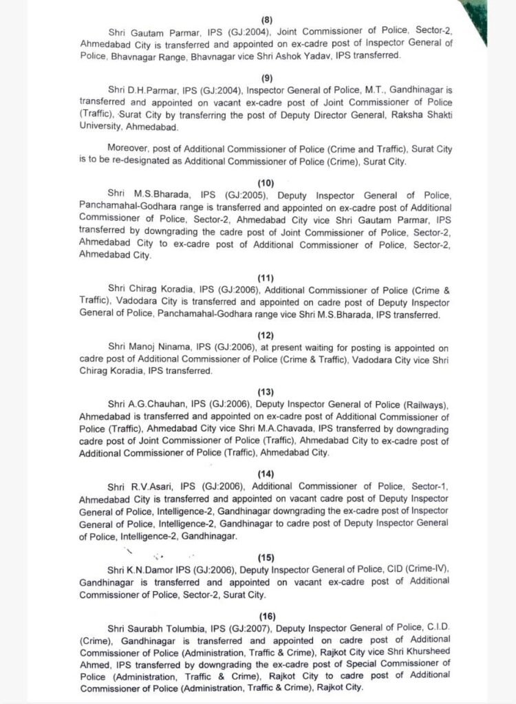 આજે જે સિનિયર IPS અધિકારીઓની બદલી કરવામાં આવી તેમાં અમદાવાદમાં સેક્ટર 1માં ફરજ બજાવતા IPS આર. વી. અસારીની બદલી ગાંધીનગરમાં IBના DIG તરીકે કરવામાં આવી છે અને તેમના સ્થાને IPS નીરાજકુમાર બડગુજરને અમદાવાદ સેક્ટર 1ના એડિશનલ કમિશનર બનાવવામાં આવ્યા છે. જ્યારે અમદાવાદમાં સેક્ટર 2માં જોઇન્ટ કમિશનર ઓફ પોલીસ તરીકે ફરજ બજાવતા IPS ગૌતમ પરમારની ભાવનગર રેન્જ IG તરીકે બદલી કરવામાં આવી છે અને તેમના સ્થાને IPS એમ. એસ. ભરાડાને અમદાવાદમાં સેકટર 2ના એડિશનલ કમિશનર બનાવવામાં આવ્યા છે. અમદાવાદ શહેરમાં જોઇન્ટ કમિશનર ઓફ પોલીસ (એડમીન)માં ફરજ બજાવતા IPS અજય ચૌધરીની બદલી અમદાવાદનાં સ્પેશિયલ બ્રાન્ચના જોઇન્ટ કમિશનર ઓફ પોલીસ તરીકે કરવામાં આવી છે. જ્યારે અમદાવાદ ટ્રાફિક પોલીસમાં જોઇન્ટ કમિશનર ઓફ પોલીસ તરીકે ફરજ બજાવતા મયંકસિંહ ચાવડાની જૂનાગઢનાં રેન્જ IG તરીકે બદલી કરવામાં આવી છે અને તેમના સ્થાને IPS એ. જી. ચૌહાણને અમદાવાદ ટ્રાફિકના જોઇન્ટ કમિશનર ઓફ પોલીસ બનાવવામાં આવ્યા છે.
