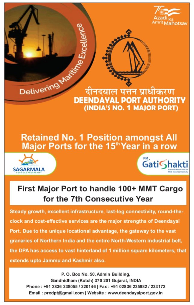 શુભ દિવાળી દીનદયાળ પોર્ટ દિવાળી પર્વ પાવન અવસર પર તમામ દેશવાસીઓ ને દિવાળી ની હાર્દિક શુભકામના અને શુભેચ્છાઓ, કચ્છ : દીનદયાલ પોર્ટ ઓથોરિટી (ભારતનું નંબર 1 મુખ્ય બંદર) બંદરો, શિપિંગ અને જળમાર્ગ સરકારનું મંત્રાલય. ઓફ ઈન્ડિયા ટ્રેડ પ્રમોશન એન્ડ પબ્લિક રિલેશન્સ સેલ નંબર GA/PRC/1525/87 દીનદયાળ પોર્ટ ના તમામ કર્મચારીઓ અને અધિકારીઓ છેલા કેટલા વર્ષો થી દીનદયાળ પોર્ટ ની નામના વધાવતા એન પ્રગતિ ના માર્ગ ના શિખર પર ક્ષમતાથી વધુ પ્રયાસો ના કાર્યોમાં સફળતા પૂર્વક મહેનત કરી રહ્યા છે જેમનું ગર્વ દેશ એન દુનિયા મા પ્રસિદ્ધ છે.